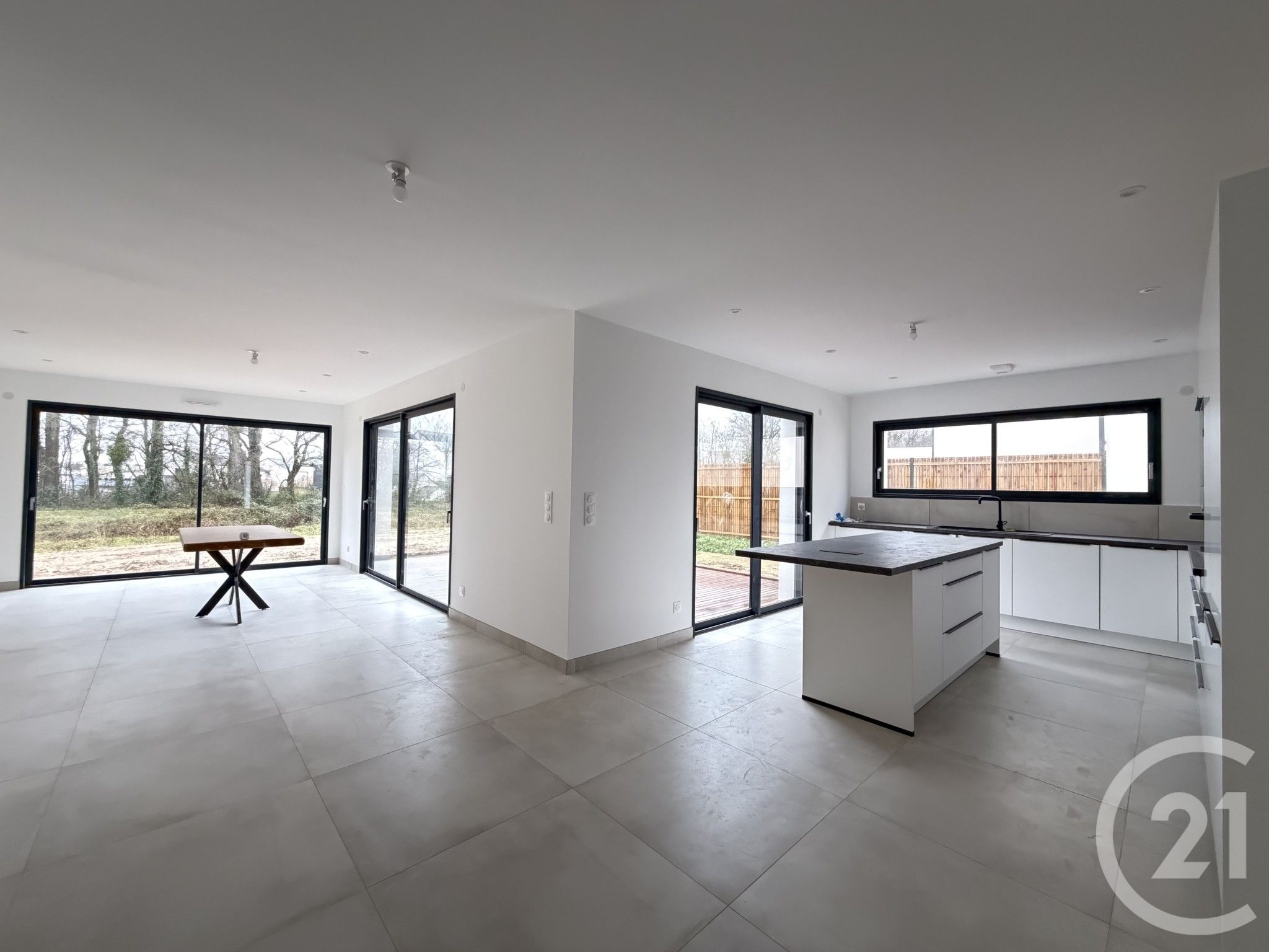 Spacieux salon-séjour lumineux donnant sur un terrasse en bois, cuisine neuve aménagée et équipée,